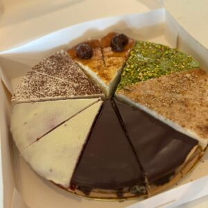 Ingredientes: Queso crema light. leche desnatada, queso quark, pistacho, Eritritol, harina de avena, huevo, chocolate blanco sin azúcar, agua, aroma de vainilla, gelatina.
